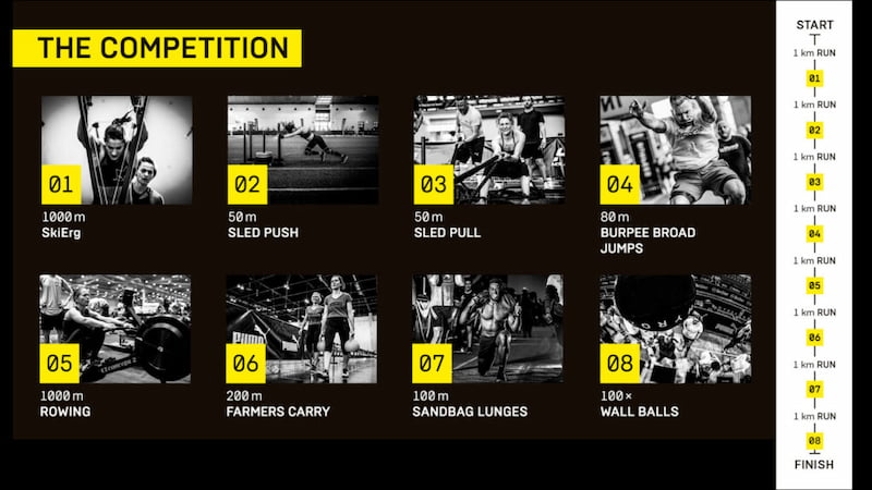 Les stations, c’est du classique – SkiErg, Sled Push, Sled Pull, Burpee Broad Jumps, Rowing, Farmer Carry, Sandbag Lunges, Wall Balls. Le scoring est simple : le chrono total définit ton classement. Pas de zones, pas de système de points.