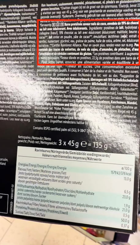 Je vais être direct : Je ne recommande pas ces barres Sportyfeel. Lidl utilise une technique bien connue des industriels pour afficher « 50% de protéines » sans se ruiner : ils coupent la protéine de lait avec du Collagène de Bœuf Hydrolysé (de la gélatine, en gros). C’est un produit qui cumule les mauvais points :