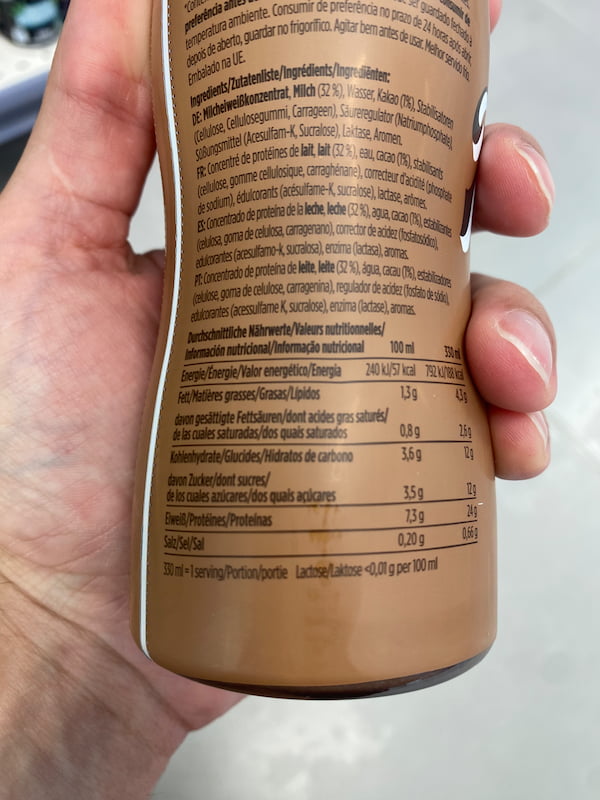 Après les barres protéines Barebells, j’ai essayé le Barebells Milkshake Chocolat. La bouteille de 330 ml, le profil nutritionnel affiché fièrement : 24 g de protéines, sans lactose, conservation à température ambiante. C’est exactement ce que la marque suédoise sait faire – un packaging soigné, des chiffres rassurants, une image premium qui fait le reste. Mais une fois qu’on lit l’étiquette complète, les choses se compliquent.