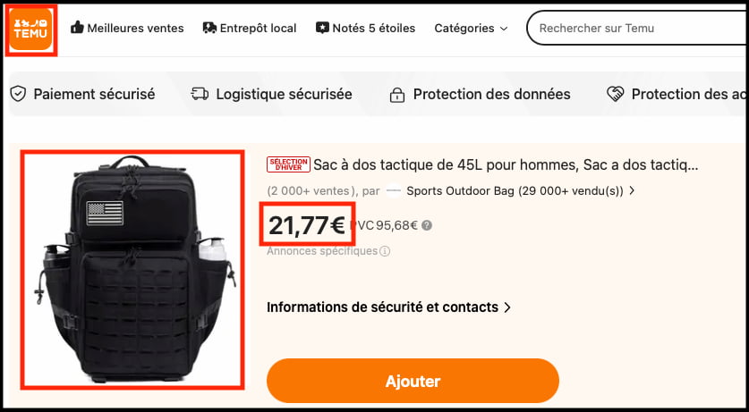 Elitex insiste lourdement : « Design européen exclusif et breveté », « Né à Cadix ». C’est ici que je dois t’inviter à faire une petite expérience. Ouvre un nouvel onglet et tape « Sac à dos tactique 45L » sur Temu, AliExpress ou Amazon.