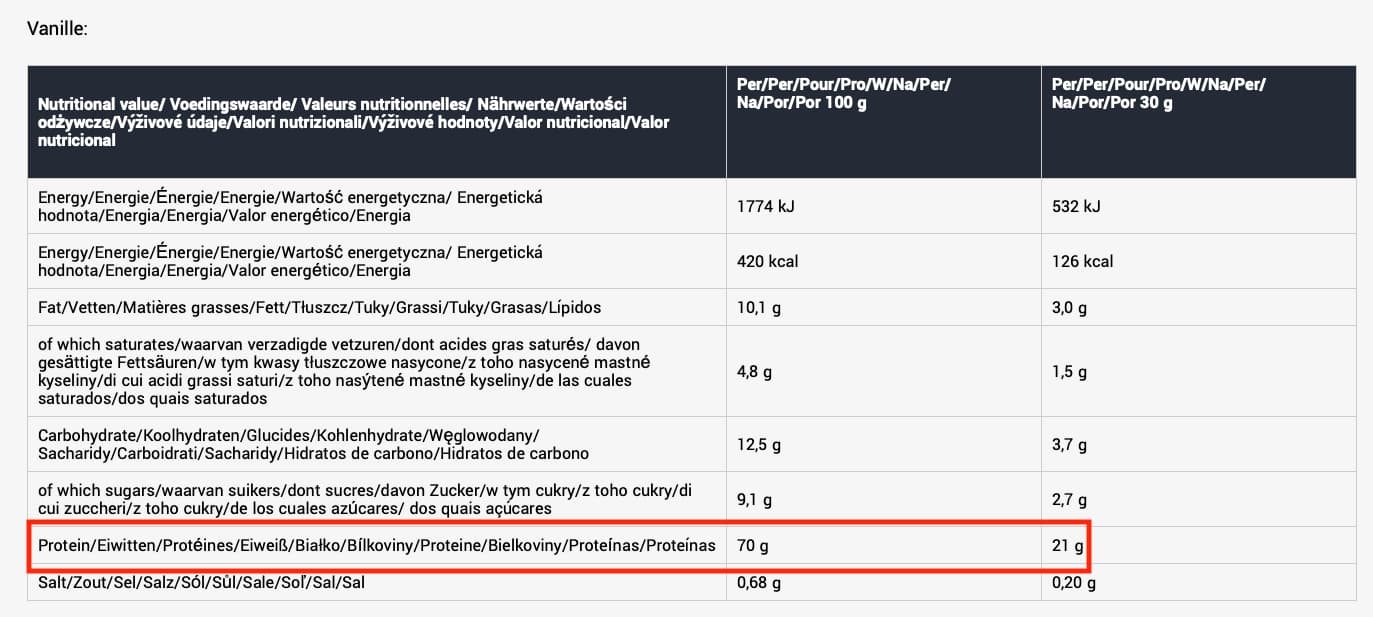 Concernant les valeurs nutritionnelles fournies par cette whey, on observe qu’elle contient 70g de protéines pour chaque 100g de produit, un taux qui, bien qu’honorable, s’avère quelque peu inférieur à ce que l’on peut trouver habituellement sur le marché des whey.