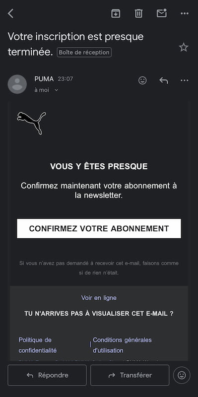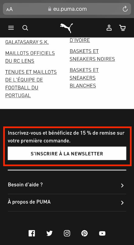 Pour bénéficier d’une réduction sur vos achats Puma, il vous suffit de vous inscrire à la newsletter officielle :
