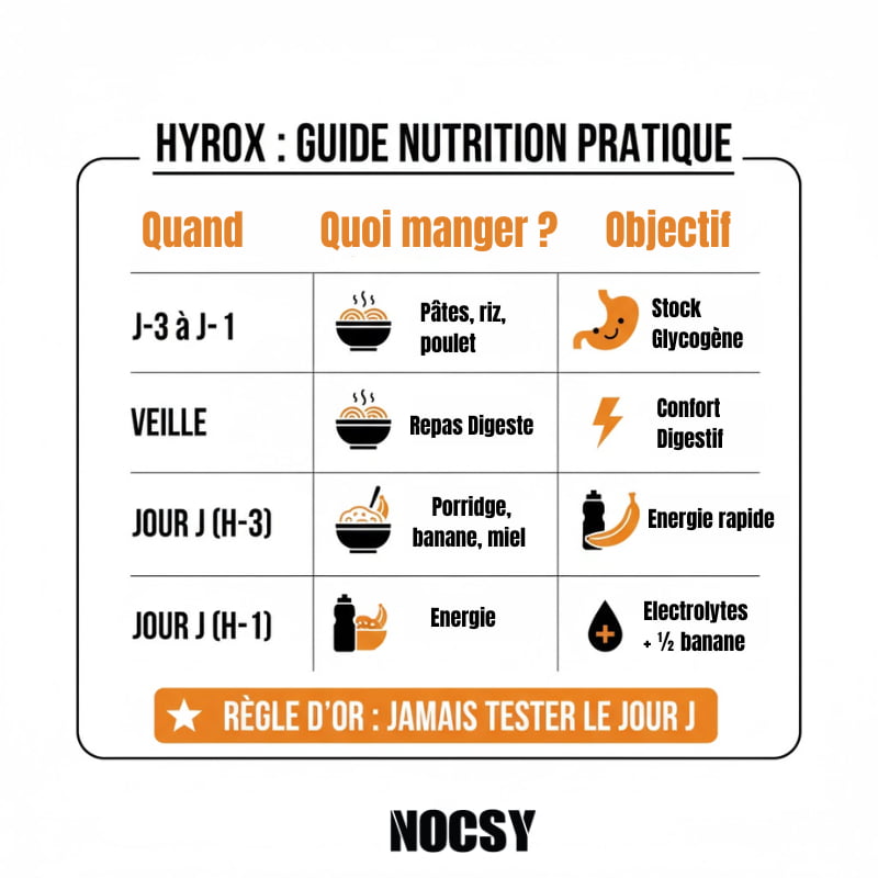 | Jour J (H-1) | Hydratation & Top-off | Boisson d’électrolytes + 1/2 banane ou 1 compote. |